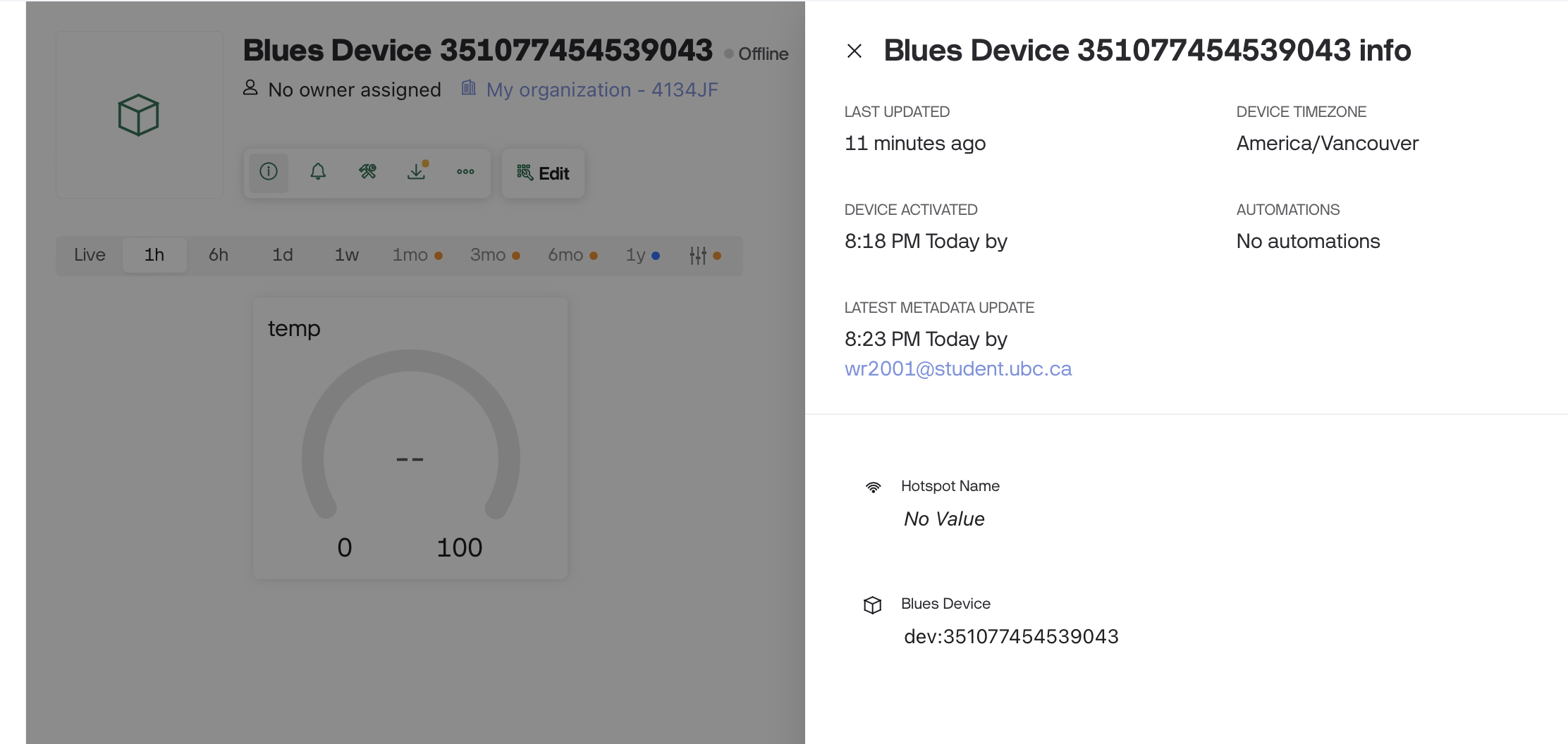 On the Blynk end, the device says that is not connected and the data stream I have for doubles under the same name of “temp” does not appear to receive data. However my messages used keeps incrementing when I try to send the data so it is reaching Blynk, as well the time of “Latest Metadata Update” for the device updates when I send data as shown below