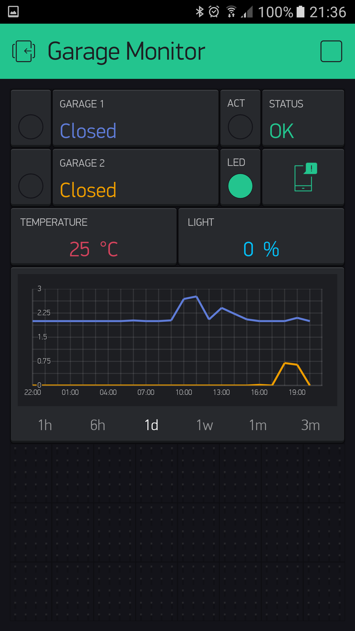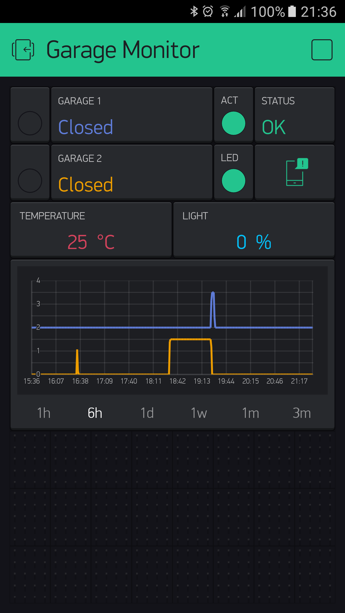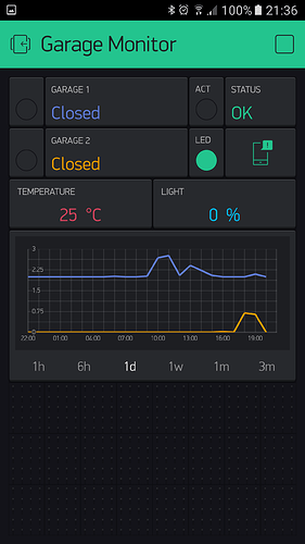 At present I am using Blynk, amongst other projects, to monitor my garages. As well as detecting whether the doors are open or closed, I am also using a History Graph widget to tell me approximately when a door opened and for how long. Unfortunately, the History Graph seems to have an averaging filter on it which smooths out the signal a lot causing a short duration digital signal to be almost a flat line. In these 2 examples below, the first is the response over 6 hours which shows quite well but when looking at the days response, the information is lost.