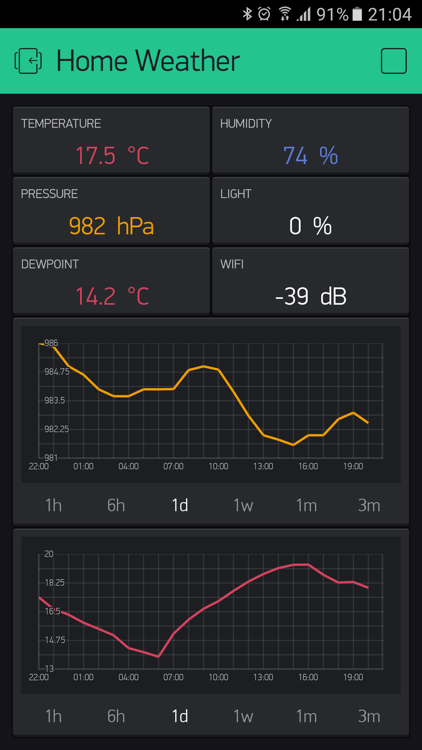 Thanks for the speedy reply. While we are on this topic of the history graph, if possible I would also like to see an option for the time axis between 1 day and 1 week. When displaying slowly changing variables 1 day does not provide enough info but 1 week is just too much info to be able to use properly. 3 days would be a more useable timeframe (see example below displaying temperature and pressure trend). Not sure if anyone uses the 3 month option but maybe delete 3 month and replace with 3 days?