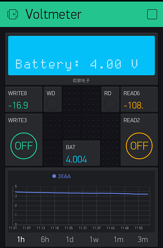 Over the last hour our ‘voltmeter’ has recorded a voltage drop from around 4.4V to 4.0V across a 3 X AA battery pack.