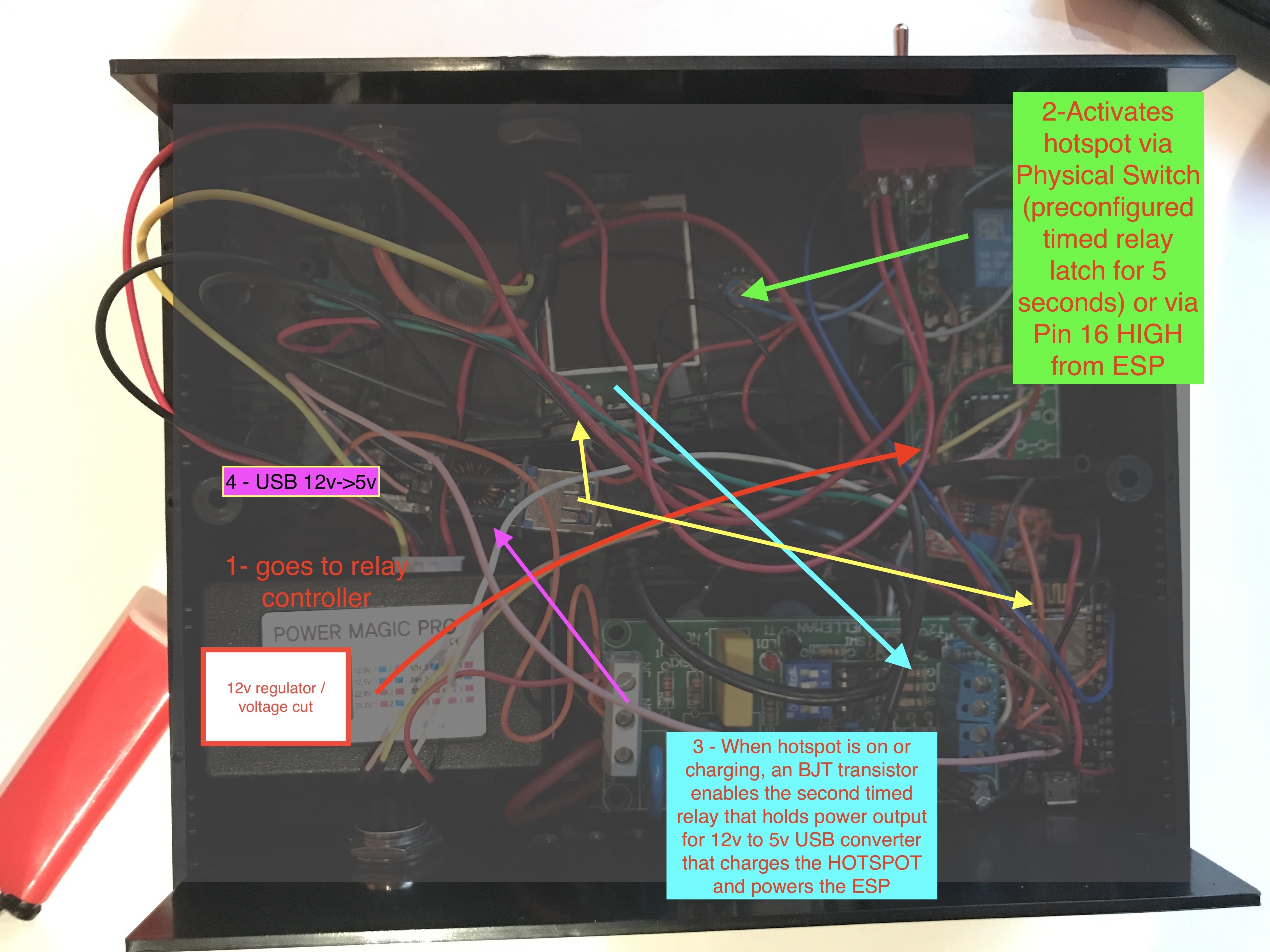 So here’s the catch: the hotspot only works with the batt on it, so i have a usb charger on a relay for 12V that is cut or powered through a TTL current on the hotspot itself. If the hotspot is on, the charger will be on too. If the hotspot is off, the charger is off too. Now: