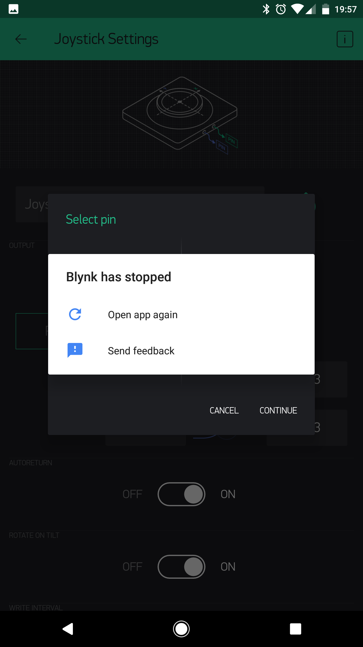 Create New Project. Add Joystick widget. Edit joystick widget. Switch output to merge. Try to assign pin. Hit continue. Blynk crashes.