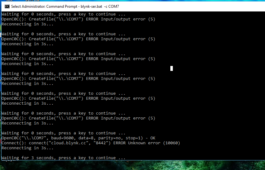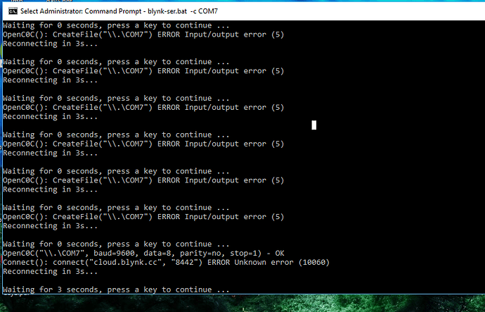 I am new to Blynk so I watched a Youtube video and following the steps I was trying to connect to blynk service from the command prompt. But after some time connection is not established and it is displaying the following message.