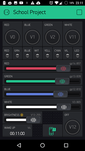 I am working on a project and need to control the brightness of the 3 leds RGB via the slider widget and cant seem to figure out how to write the code. Can some one edit my code. It is working perfectly but not the the slider and when I use widget led I am getting an error login timeout.